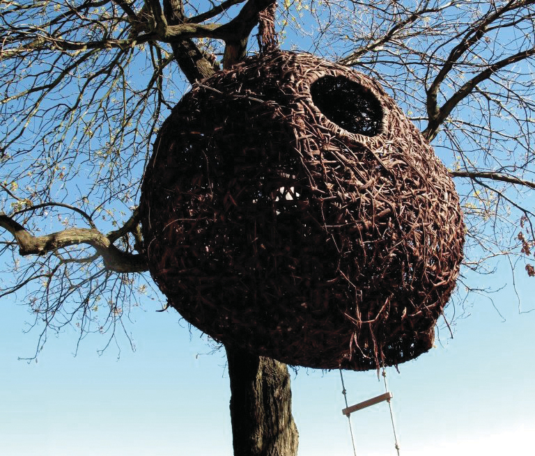 Le créateur Porky Hefer s’est inspiré de la nature pour créer des structures, habitables suspendues, réalisées à partir d’écorces et de branchages tressés ressemblant à s’y méprendre à des nids d’oiseaux. Pour y parvenir, l’artiste a scrupuleusement étudié les techniques de construction des tisserins afin de les reproduire. Ces étonnants oiseaux parviennent, avec leur simple bec, à construire collectivement des nids extraordinaires, pouvant abriter jusqu’à 300 familles et mesurer jusqu’à sept mètres de large et quatre mètres de haut.