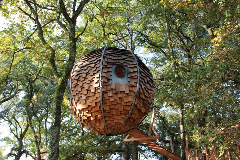 À l’évidence, ce charmant nid d’amour a été conçu par l’homme pour son propre usage. Cette sphère en bois, suspendu par des câbles à quatre mètres de hauteur, est équipée d’un grand lit, de prises électriques et même d’un chauffage. Elle est reliée par un pont de singe de 12 mètres de long à une cabane montée sur pilotis avec salle de bains et terrasse. Situé en Aquitaine, ce nid accueille les bipèdes pour des nuits insolites parmi les écureuils et les oiseaux.