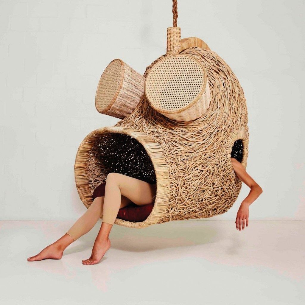 Après les nids géants, Porky Hefer s’est lancé avec humour dans la création de fauteuils suspendus, réalisés sur le même principe à partir de canne à sucre, de raphia et de cuir. Le succès fut immédiat. De par leur fabrication, ces créations mettent en lumière l’artisanat local de l’Afrique du Sud, son pays d’origine.